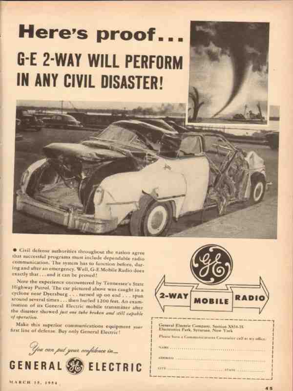 Original vintage oil and gas trade magazine ad for GENERAL ELECTRIC COMPANY of Syracuse, NY. Here's Proof G-E 2 Way Mobile Radio Will Perform In Any Civil Disaster! State Highway Patrol car caught in a tornado near Dyersburg had just one tube broken and still capable of operation. Old 1954 petroleum industry oilfield and refinery advertisement.