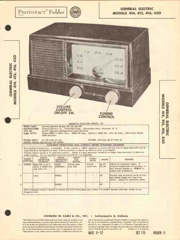 Vintage GENERAL ELECTRIC models 414, 415, 416 and 430 5 tube Superheterodyne AM radio receiver. Original old Sams Photofact manual includes schematic, layouts, alignment info, voltage & resistance test chart, repair parts list. 4 pages. Dated 1952.