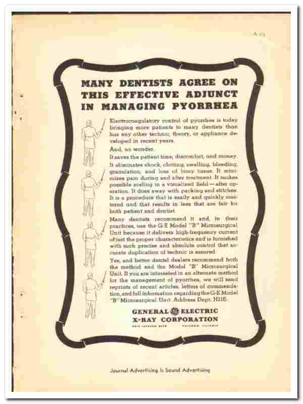 Products include the G-E Model 'B' Microsurgical Unit. Electrocoagulatory control of pyorrhea is today bringing more patients to many dentists than has any other technic, theory or appliance developed in recent years. And, no wonder. It saves the patient time, discomfort and money. It eliminates shock, clotting, swelling, bleeding, granulation and loss of boney tissue. It minimizes pain during and after treatment. It makes possible scaling in the visualized field, after operation. It does away with packing and stitches. It is a procedure that is easily and quickly mastered and that results in fees that are fair for both patient and dentist. Many dentists recommend it and, in their practices, use the G-E Model 'B' Microsurgical Unit because it delivers High Frequency current of just the proper characteristics and is furnished with such precise and absolute control that accurate duplication of technic is assured.