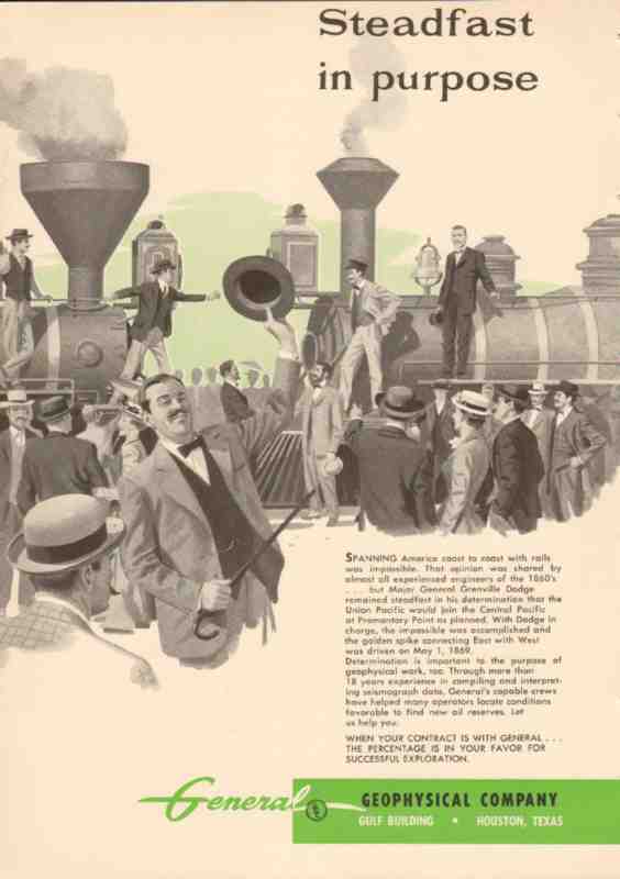 Original oil and gas trade magazine vintage ad for GENERAL GEOPHYSICAL COMPANY, was located in the Gulf Building, Houston, TX. Steadfast Major General Greenville Dodge determined that the Union Pacific Railroad would join the Central Pacific at Promontory Point. Determination is important to the purpose of geophysical work too. This unique 1953 old one page oilfield petroleum drilling industry magazine advertisement would display beautifully matted and framed. Nice graphics.