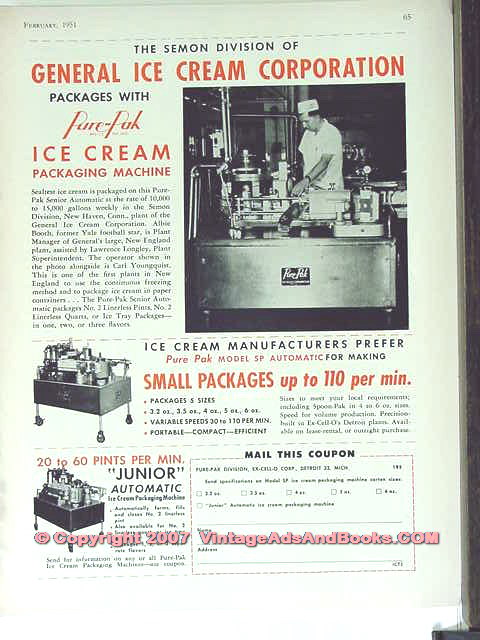 Original ice cream trade magazine vintage ad for GENERAL ICE CREAM CORPORATION. Packages with Pure-Pak Ice Cream Packaging Machine. Pictured is Sealtest ice cream being packaged on a Pure Pak Senior Automatic in the Semon Division, New Haven, CT plant of the General Ice Cream Corporation. The operator shown in the photo is Mr Carl Youngquist. Mr Albie Booth, former Yale football star, is Plant Manager of General's New England plant, assisted by Mr Lawrence Longley, the Plant Superintendent. This unique 1951 old dairy industry magazine advertisement would display wonderful matted and framed. Nice graphics. Approximate size 8.5 x 11 inches.