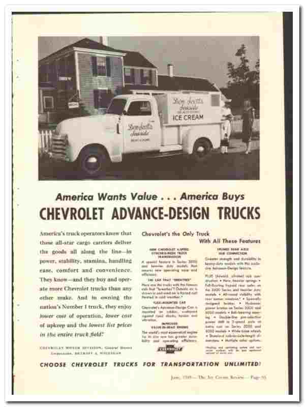 Original 1949 ice cream truck vintage magazine ad for the GENERAL MOTORS CORPORATION. (Chevrolet Motor Division). Main office and plant were located in Detroit, MI.