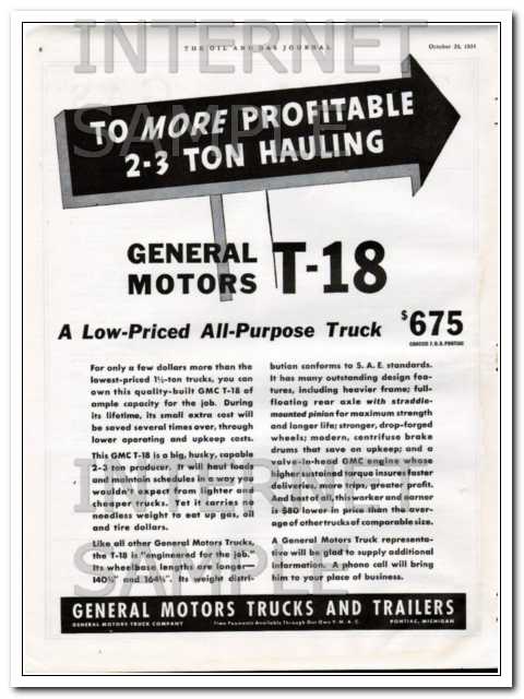 Original vintage oil and gas magazine ad, GENERAL MOTORS TRUCK COMPANY of Pontiac, MI. T-18 A Low Priced All Purpose Truck. To More Profitable 2-3 Ton Hauling. GM Company. Old 1934 dated petroleum industry advertisement.