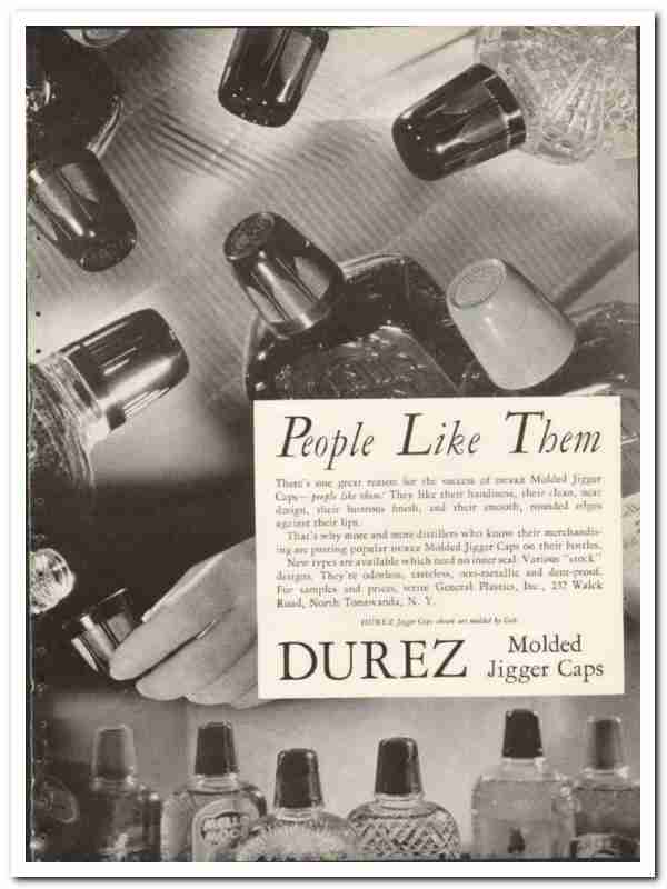 People Like Them. There's one great reason for the success of Durez Molded Jigger Caps - people like them! They like their handiness, their clean, neat desigb, their lustrous finish and their smooth, rounded edges against their lips. That's why more and more distillers who know their merchandising are putting popular Durez Molded Jigger Caps on their bottles. New types are available which need no inner seal. Various stock designs. They're odorless, tasteless, non-metallic and dent proof. Durez Jigger Caps shown are molded by Colt.