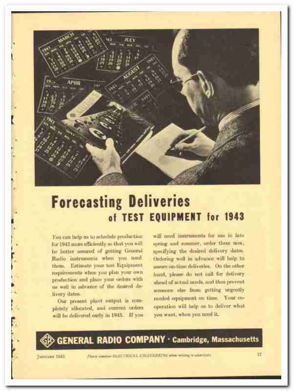 You can help us schedule production for 1943 more efficiently so that you will be better assured of getting General Radio instruments when you need them. Estimate your test Equipment requirements when you plan your own production and place your orders with us well in advance of the desired delivery dates.