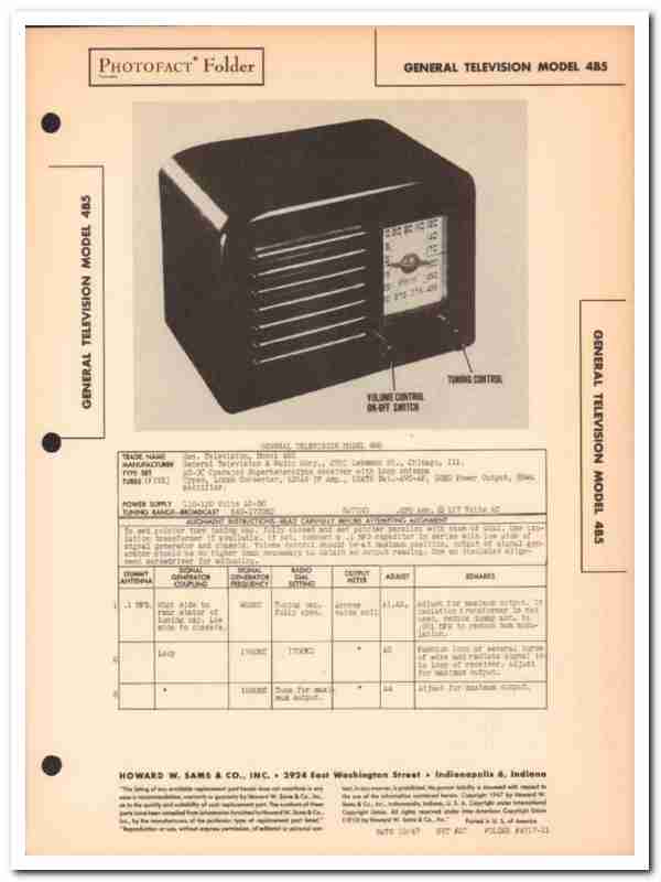 Vintage Radio Service Manual - GENERAL TELEVISION model 4B5 5-tube Superheterodyne AM radio receiver. Manufactured by General Television & Radio Corp., of Chicago, IL. Dated 1947. 4 pages. Original old Sams Photofact manual includes schematic, layout, alignment instructions, voltage & resistance test chart, repair parts list and description. This manual would make a sensational accompaniment to your retro audio equipment.