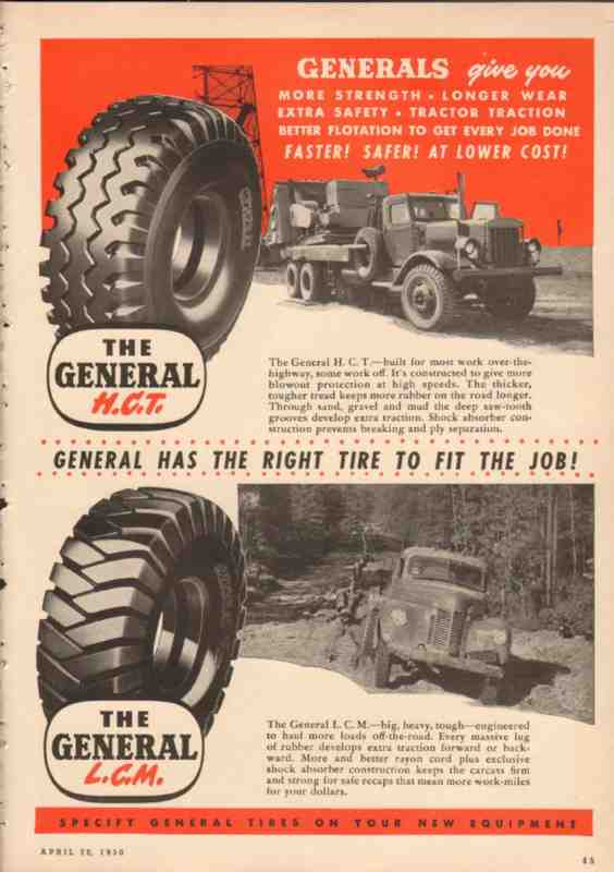 Original old petroleum trade magazine vintage ad for GENERAL TIRE AND RUBBER COMPANY. HCT strength, extra safety, longer wear, better truck traction. Built for most work over the highway, some off road. Gives blowout protection at high speeds. LMC is tough, engineered to haul more lads off-road.