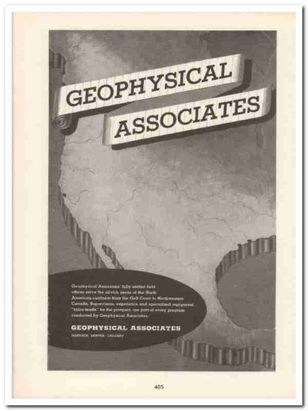 Original oil and gas trade magazine vintage ad for GEOPHYSICAL ASSOCIATES, INC. Office were located in Houston, Texas, Denver, Colorado and Calgary, Alberta, Canada. Fully Staffed Field Offices serve the oil-rich areas of the North American continent from the Gulf Coast to Northwestern Canada. Supervision, experience and specialized equipment tailor-made for the prospect. This unique 1958 old oilfield petroleum seismic exploration magazine advertisement would display beautifully matted and framed.