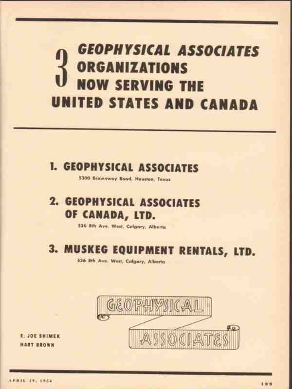 Original oil and gas trade magazine vintage ad for GEOPHYSICAL ASSOCIATES, INC. was located at 5300 Brownway Road, Houston, TX. Now Serving The United States and Canada. E. Joe Shimek, and Hart Brown. This unique 1954 old oilfield petroleum industry equipment magazine advertisement would look fantastic matted and framed.