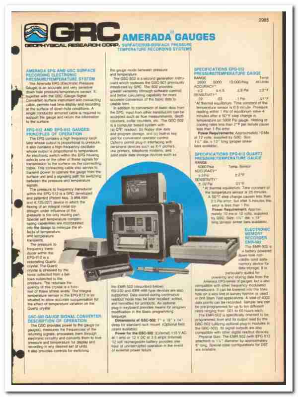 Products include Amerada EPG & GSC Surface Recording Electronic Pressure Temperature System, Amerada RPG-3, RPG-4, RPG-5 Gauges, Chart Scanners, Calibration Bath & Shut-In Tool, all are fully featured.