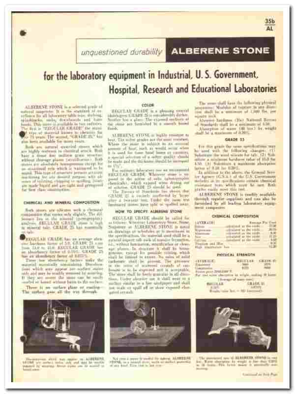 Alberene Stone is a selected grade of natural soapstone. It is the standard of excellence for all laboratory table tops, shelving, splashbacks, sinks, drainboards and fume hoods. The stone is available in two varieties. The first is Regular Grade the standard type of material known to chemists for over 75 years period the second, Grade 25, has also been available for many years. Both are natural quarried stones which are highly resistant to chemical attack. Both have a dense fine uniform grain structure without cleavage planes (stratification). Both stones are absolutely homogeneous except for an occasional vein which is warranted to be sound. This type of structure permits accurate machining for any desired purpose with absence of splitting, chipping or spalling. Joints are made liquid & gas tight and germ-proof for first class construction'.
