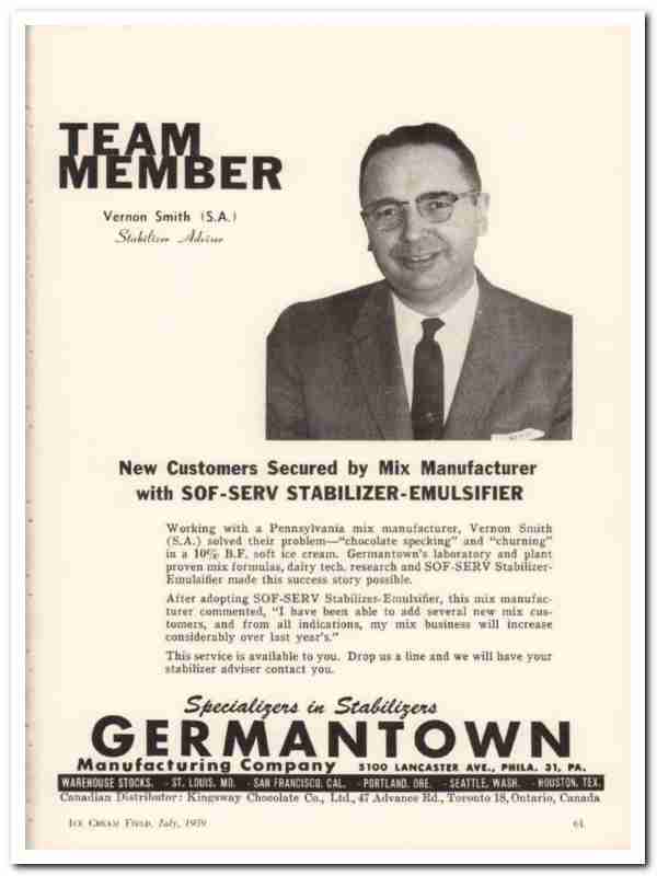 Original ice cream trade magazine vintage ad for GERMANTOWN MANUFACTURING COMPANY. Main office and plant was located at 5100 Lancaster Avenue, Philadelphia, PA. Manufacturers of Ice Cream Stabilizer. Pictured is Mr Vernon Smith, a stabilizer adviser. Working with a Pennsylvania mix manufacturer, Vernon solved their problem of chocolate specking and churning in a 10 percent B.F. soft ice cream. This unique 1959 old dairy industry magazine advertisement would display wonderful matted and framed. Nice graphics.