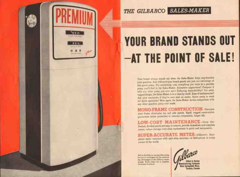 Original old gasoline service station trade magazine vintage ad for GILBERT AND BARKER MANUFACTURING COMPANY. Main office and factory was located in West Springfield, MA. Sales-Maker gas pump helps merchandise your gas. Your brand stands out at the point of sale. This unique 1957 2-page gatefold advertisement would display beautifully matted and framed.