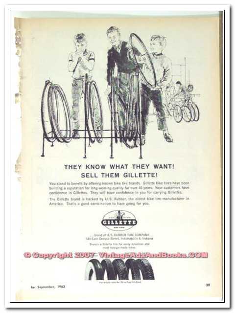 Original vintage magazine ad for GILLETTE BIKE TIRES backed by U.S. Rubber Tire Company of Indianapolis, IN. They Know What They Want! Sell Them Gillette! Old 1963 dated bicycle industry advertisement.