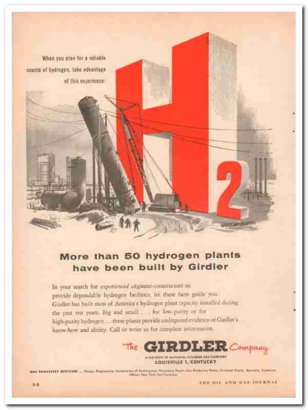 Original oil and gas trade magazine vintage ad for THE GIRDLER COMPANY, A Division of National Cylinder Gas Company. Main office was located in Louisville, KY. When you plan for a reliable source of hydrogen, take advantage of this experience, more than 50 hydrogen plants have been built by Girdler. Experienced engineer constructors provide dependable hydrogen facilities. This unique 1957 old petrochemical hydrogen production magazine advertisement would display beautifully matted and framed. Nice graphics.