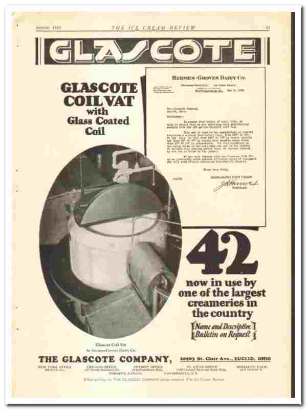 Original 1928 ice cream trade vintage magazine ad for the GLASCOTE COMPANY. Main office and plant were located in Euclid, OH.