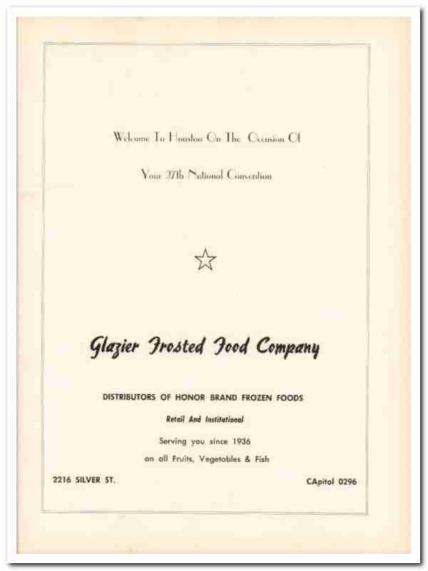 Original 1953 Greek-American business trade magazine vintage ad for the GLAZIER FROSTED FOOD COMPANY. They were located at 2216 Silver Street, in Houston, Texas. Distributors of Honor Brand frozen foods. Retail and Institutional. Serving since 1936 on all Fruits, Vegetables & Fish. Welcome Ahepans to Houston.