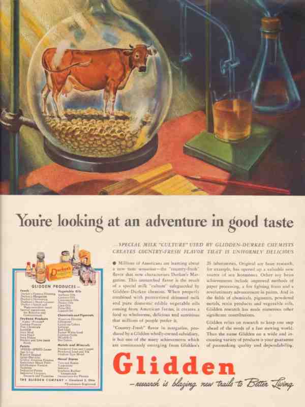 Original old trade magazine ad for THE GLIDDEN COMPANY of Cleveland, OH. You're Looking at an Adventure in Good Taste, Special Milk Culture Used by Glidden Durkee Chemists Creates Country Fresh Flavor that is Uniformly Delicious. Many famous foods such as Durkee's Margarine, Durkee's Famous Dressing, Durkee's Worcestershire Sauce, Soybean oils, Soybean products. Also chemicals and pigments, metals and minerals, Paints, Naval Stores. This 1947 magazine advertisement would display beautifully matted and framed.