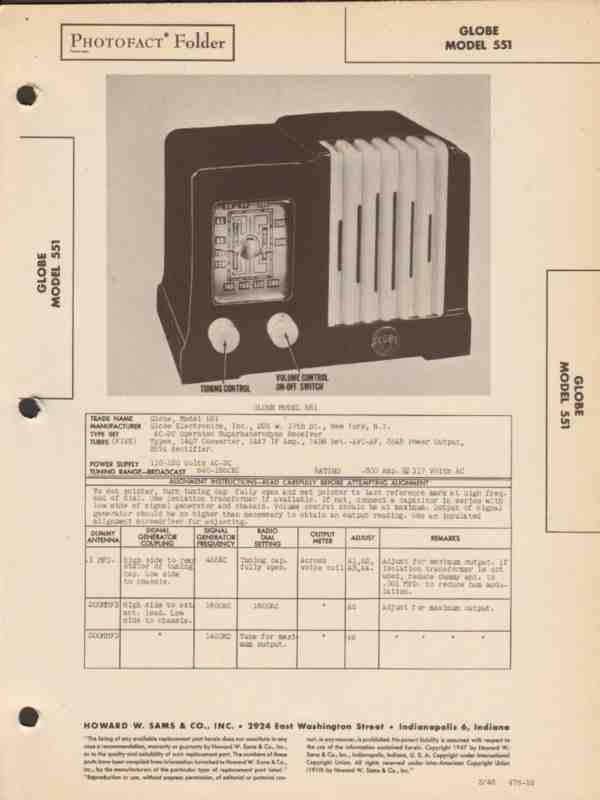 Vintage GLOBE model 551 5 tube Superheterodyne AM radio receiver. Original old Sams Photofact manual includes schematic, layout, alignment instructions, voltage & resistance test charts, repair parts list and description. 4 pages. Dated 1947. Globe Electronics Inc of New York, NY. This manual would make a sensational accompaniment to your classic retro radio equipment.