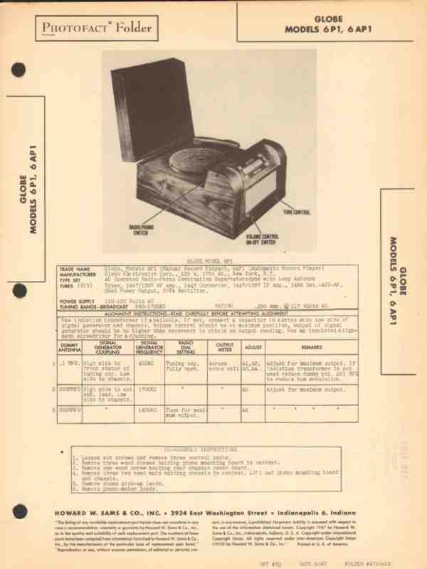 globe model 6p1 6ap1 am radio receiver phono sams photofact manual