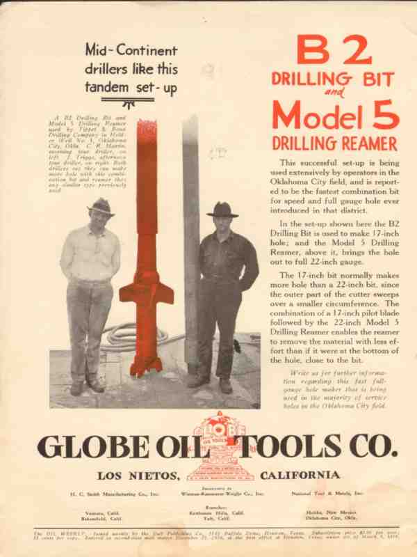 Original oil and gas trade magazine vintage ad for GLOBE OIL TOOLS COMPANY of Los Nietos, CA. B2 Drilling Bit and Model 5 Drilling Reamer used by Tippet & Bond Drilling Company, of Oklahoma City, OK in Holder Well No. 1, Oklahoma City Field. Pictured are Mr. C.R. Martin, morning tour driller and Mr J. Triggs, afternoon tour driller. This unique 1930 old oilfield petroleum drilling equipment magazine advertisement would display fantastic matted and framed. Nice graphics..