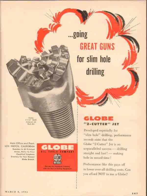 Original oil and gas trade magazine vintage ad for GLOBE OIL TOOLS COMPANY of Los Nietos, CA. Going Great Guns for Slim Hole Drilling, Globe 2-Cutter Jet. SS2C. Unique 1954 old oilfield petroleum drilling industry equipment magazine advertisement. Nice graphics.