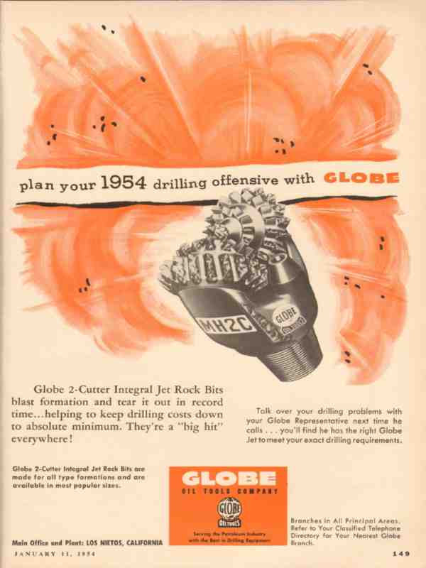 Original oil and gas trade magazine vintage ad for GLOBE OIL TOOLS COMPANY of Los Nietos, CA. Plan Your 1954 Drilling Offensive with Globe 2-Cutter Integral Jet Rock Bits. Unique dated 1954 old oilfield petroleum drilling industry equipment magazine advertisement. Great graphics.