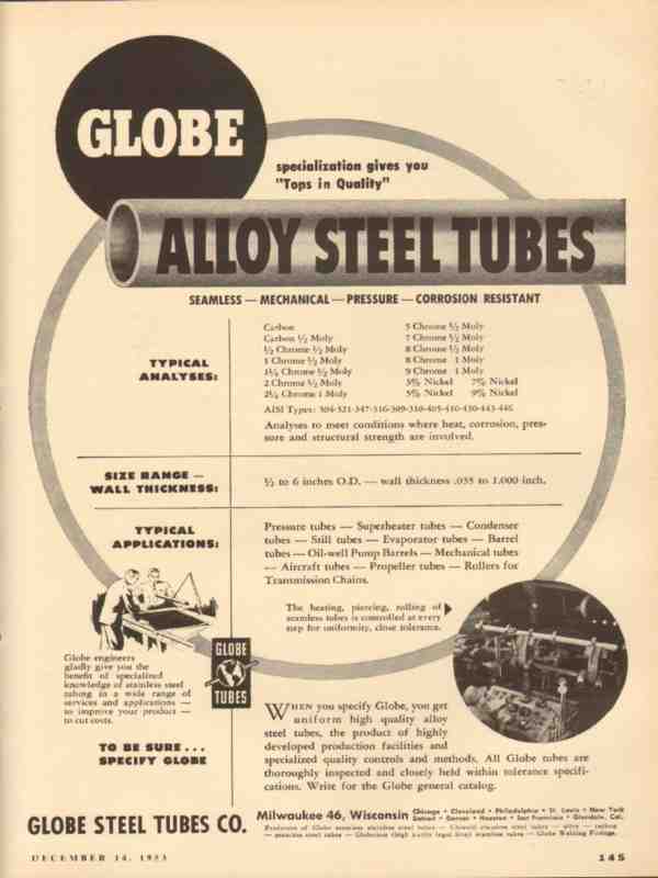 globe steel tubes company 1953 tops in quality alloy pipe vintage ad