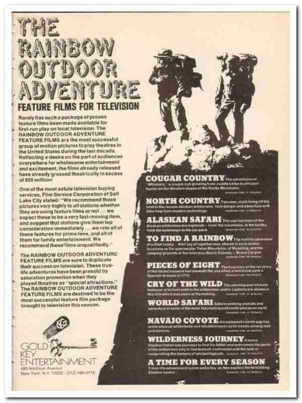 Original broadcasting media vintage magazine ad for GOLD KEY ENTERTAINMENT. The Rainbow Outdoor Adventure feature films for TV. Rarely has such a package been made available for first-run play on local television. These true life adventures have been presold by saturation promotion when they played theaters as special attractions. They include Cougar Country, North Country, Alaskan Safari, To Find a Rainbow, Pieces of Eight, Cry of the Wild, World Safari, Navajo Coyote, Wilderness Journey, and A Time for Every Season.