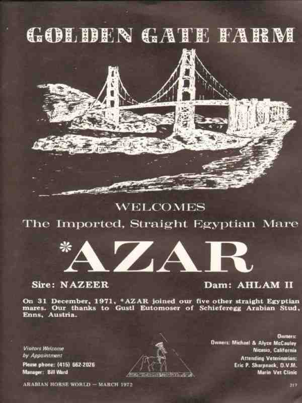 golden gate farm 1972 azar egyptian mare arabian horse vintage ad