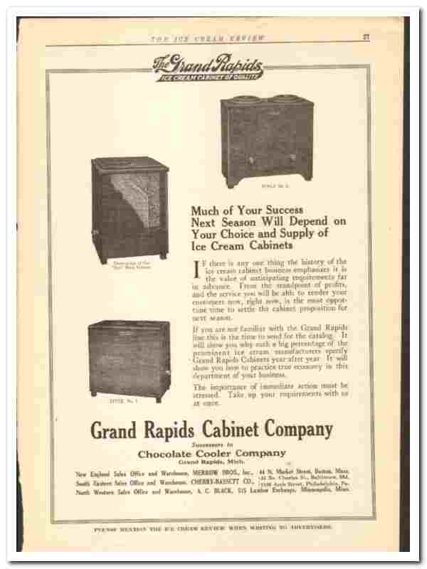 Original 1920 ice cream trade vintage magazine ad for the GRAND RAPIDS CABINET COMPANY. (Successor to the Chocolate Cooler Company). Main office and plant were located in Grand Rapids, MI.