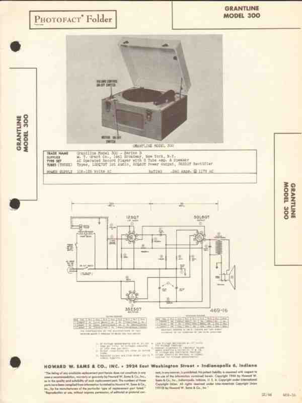 Vintage GRANTLINE model 300 record player phonograph with 3 tube amplifier and speaker. Original old Sams Photofact manual includes schematic, layout, voltage & resistance test charts, repair parts list and description. Dated1946. 2 pages. W.T. Grant Company, of New York, NY. This manual would make a sensational accompaniment to your classic retro phono equipment.