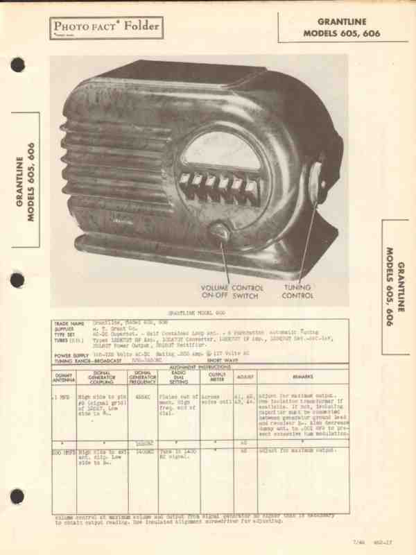 grantline model 605 606 6 tube am radio receiver sams photofact manual