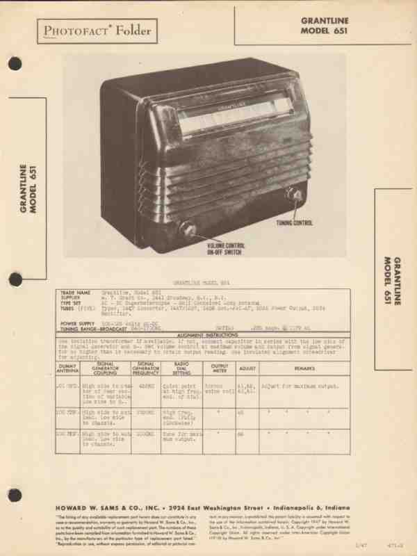 Vintage GRANTLINE model 651 5 tube AM radio receiver. Original old Sams Photofact manual. Includes schematic, layout, alignment instructions, voltage & resistance test chart, repair parts list and description. 4 pages. Dated 1947. W.T. Grant Company, of New York, NY. This manual would make a sensational accompaniment to your classic radio equipment.