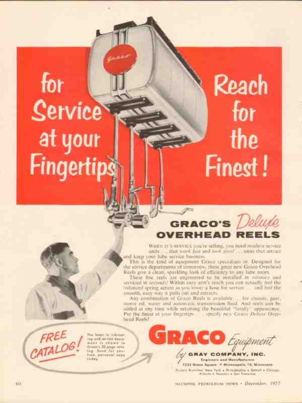 Original old retail petroleum trade magazine vintage ad for GRAY COMPANY, INC of Minneapolis, MN. For Service At Your Fingertips, Deluxe Overhead Reels. This unique 1957 gasoline service station equipment advertisement would display beautifully matted and framed.