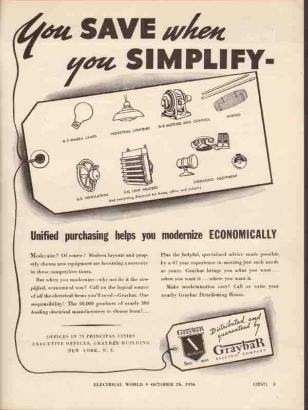 Original old electrical industry trade magazine ad for GRAYBAR ELECTRIC COMPANY of New York City, NY. You Save When You Simplify. Unified purchasing helps you modernize economically. This 1936 industry magazine advertisement would display beautifully matted and framed.
