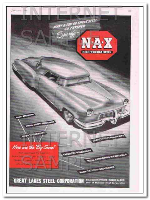 Original vintage industrial magazine ad, for GREAT LAKES STEEL CORPORATION of Detroit, MI. Make A Ton of Sheet Steel Go Farther Specify N-A-X High-Tensile Steel. Bumpers, Grilles, Fenders, Hoods, Bodies, Frames, Wheels, and Other Automotive Parts. Old 1948 metal industry advertisement. (The scan shows a slight pink tint that is not on the actual ad.)