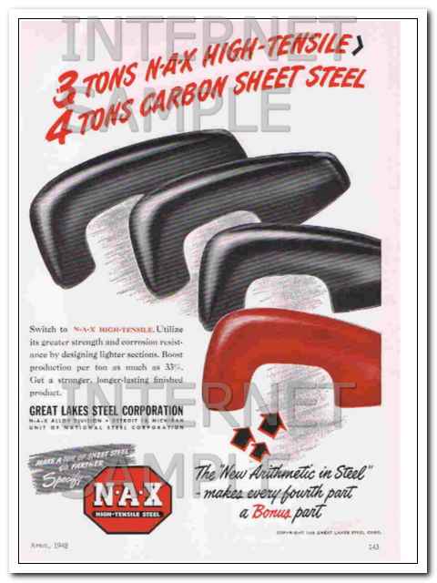 Original vintage industrial magazine ad, for GREAT LAKES STEEL CORPORATION of Detroit, MI. N-A-X High-Tensile Carbon Sheet Steel. Old 1948 dated metal industry advertisement. (The scan shows a slight pink tint that is not on the actual ad.)