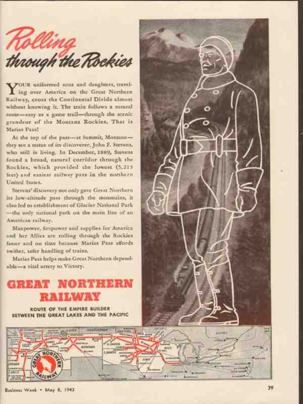 Original World War 2 business industry trade magazine vintage ad for GREAT NORTHERN RAILWAY. Rolling Through the Rockies on the Great Northern Railway. At Summit, Montana is a statue of its discoverer, John F. Stevens. Manpower, firepower and supplies for America and her Allies are rolling through the Rockies faster and on time because Maria Pass affords swifter, safer handling of trains. Old 1943 WW2 era propaganda magazine advertisement.