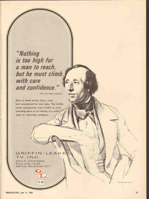 Original vintage television broadcasting trade magazine ad for GRIFFIN LEAKE TV, INC. Nothing is too High for a Man to Reach, But He Must Climb with Care and Confidence. Hans Cristian Anderson. The Griffin-Leake management urges Care in every operating phase at its stations, as a valid basis for deserving confidence. KATV KTUL KWTV Old 1965 television industry advertisement.