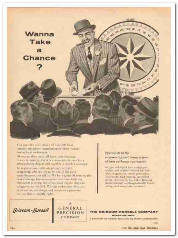 Original oil and gas trade magazine vintage ad for THE GRISCOM-RUSSELL COMPANY. Main office was located in Massillon, OH. Why take Chance on Heat Transfer Equipment? Specialists in the engineering and construction of air, gas and liquid exchangers, coolers and heater, finned and bare tube, evaporators, steam generators, condensers, sea water distilling plants, helically and longitudinally finned tubing, and many other products. This unique 1959 old petroleum refinery process industry equipment magazine advertisement would display beautifully matted and framed.