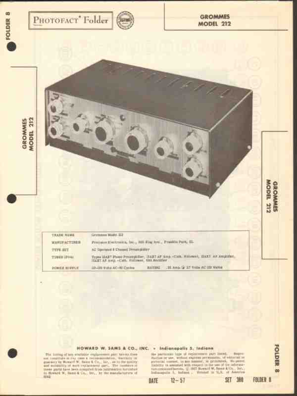 Vintage GROMMES model 212 8 channel audio preamplifier. Original old Sams Photofact manual. Includes schematics, layouts, voltage & resistance readings, and parts list. 8 pages. Dated 1957. Precision Electronics Inc. of Franklin Park, IL. This would make a sensational accompaniment to your vintage audio equipment.