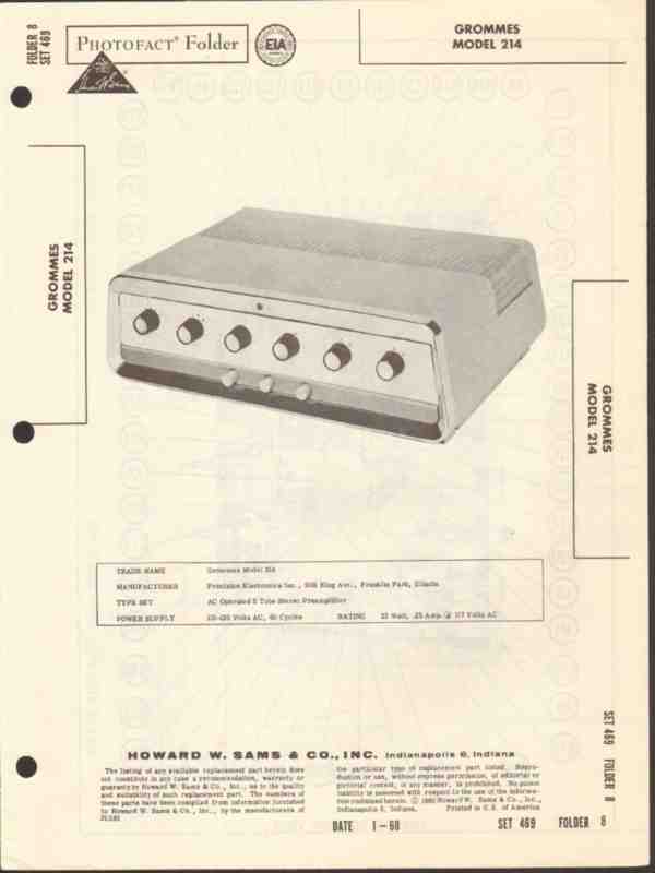 Vintage GROMMES model 214 Stereo audio preamplifier. Original old Sams Photofact manual. Includes schematics, layouts, voltage & resistance readings, and parts list. 5 pages. Dated 1960. 5 tubes. Precision Electronics Inc. of Franklin Park, IL. This would make a sensational accompaniment to your vintage audio equipment.