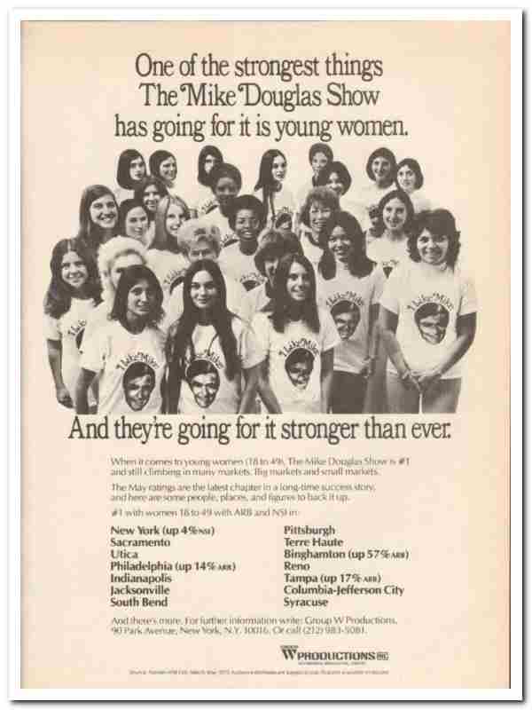 Original media vintage magazine ad for GROUP W PRODUCTIONS INC. Strongest things The Mike Doublas Show has going for it is young women. And they're going for it stronger than ever. Number one with women 18 to forty nine.