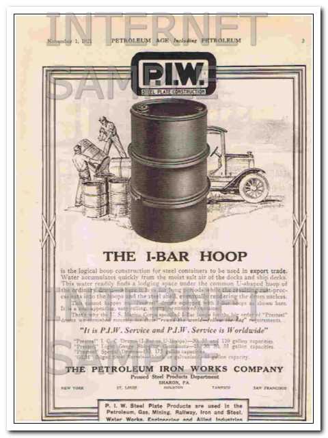On the reverse side (see Additional Images tab) is THE PETROLEUM IRON WORKS COMPANY of Sharon, PA. The I-Bar Hoop is on Presteel drums. P. I. W. Steel Plate Construction. Old petroleum refining industry advertisement.
