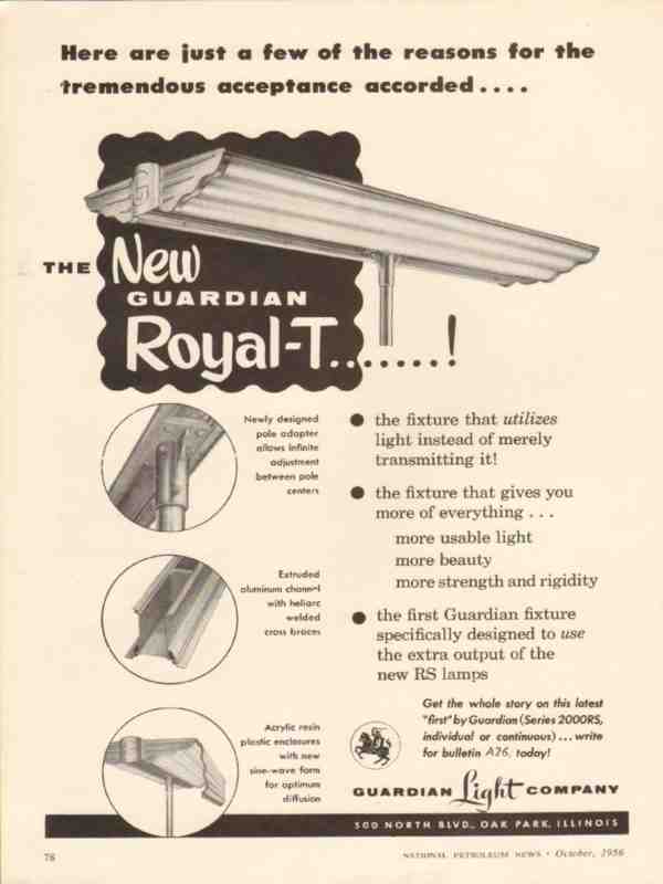 Original old electrical trade magazine vintage ad for GUARDIAN LIGHT COMPANY of Oak Park, IL. Royal-T Service Station Fixture gives you more of everything. This unique old 1956 lighting advertisement would display beautifully matted and framed.