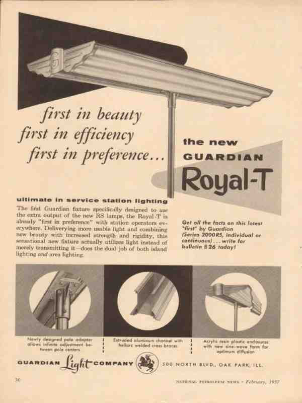 Original old retail petroleum trade magazine vintage ad for GUARDIAN LIGHT COMPANY of Oak Park, IL. Royal-T Service Station, First in Beauty, Efficiency, Preference. Ultimate in electrical lighting. This unique old 1957 gasoline advertisement would display beautifully matted and framed.