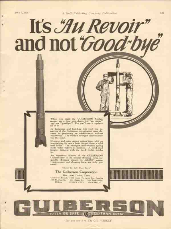 Original oil and gas trade magazine vintage ad for THE GUIBERSON CORPORATION, of Dallas, TX.  It's Au Revoir and Not Good Bye with the Guiberson Underreamer on the Long Trip Down. Unique 1928 old oilfield petroleum drilling industry equipment magazine advertisement. Nice graphics.