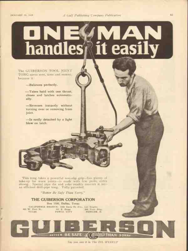 Original oil and gas trade magazine vintage ad for THE GUIBERSON CORPORATION, of Dallas, TX. One Man Handles It Easily with the Guiberson Tool Joint Tong. Unique 1928 old oilfield petroleum drilling industry tools and equipment magazine advertisement. Nice graphics.