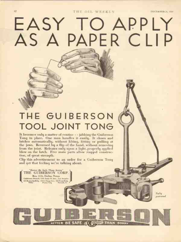 Original oil and gas trade magazine vintage ad for THE GUIBERSON CORPORATION, of Dallas, TX. Easy to Apply as a Paper Clip, The Guiberson Tool Joint Tong. Unique 1930 old oilfield petroleum drilling industry equipment magazine advertisement. Nice graphics.